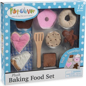 Your child can show off their sweet tooth with this 12-piece play set featuring a mix of plush sweet treats and accessories. The colorful set includes a mix of cookies, a donut with optional frosting, brownies and baking tools featuring plush designs made for little hands.