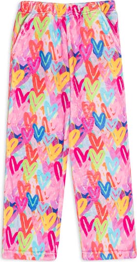 Super soft, luxurious, and cozy plush girls' loungewear pants featuring a fun, vibrant heart print. Features side pockets and an elastic waist for comfortable wear all day long.