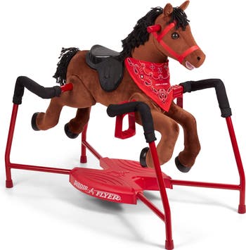 - Realistic riding sounds change the faster you go 3 levels of riding - walk, trot, gallop - that trigger different realistic riding sounds Carrot activates chewing sounds to encourage imaginative play Built-in safety straps for protection Deluxe fabric, soft to touch Includes comb accessory and carrot that prompts eating sounds when "fed" Innovative “X” frame base with EZ Climb™ step to allow for easy on and off Suitable for toddlers and kids aged 2 to 6 years old Spring covers for pinch protection Patented EZ Climb™ step