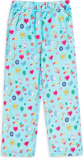 Super soft, luxurious, and cozy plush girls' loungewear pants featuring a fun lucky charm motif print. Features side pockets and an elastic waist for comfortable wear all day long.