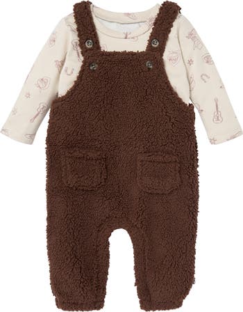 This baby boy overall and top set is made for cooler days and cozy play. The microplush overalls are thick and velvety-soft, offering a plush feel that keeps him warm, while the stretchy hacci top underneath adds breathable comfort. Designed with cinched ankles to help the overalls stay put and twin front pockets for a playful, utility-inspired look, this set is as practical as it is charming. Faux wood buttons at the straps add a stylish finishing touch, making this outfit a go-to for comfort with elevated detail. Our essentials have been independently certified with STANDARD 100 by OEKO-TEX® so that you don’t have to worry about harmful substances in your little one's wardrobe. Pack includes plush overall and long sleeve top from modern moments™ by Gerber®®.