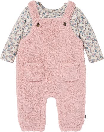 She'll enjoy softness and style with this plush overall and top set, perfect for cozy days and seasonal outings. The microplush overalls offer a thick, snuggly texture that provides warmth without weighing her down, while the coordinating hacci knit long sleeve top stretches gently for all-day flexibility. Cinched ankles help keep the fit secure as she plays, crawls, or twirls, and faux wood buttons at the straps add a charming, boutique-inspired finish. This cozy, layered look is a must-have for cooler days—cute enough for family outings and comfortable enough for everyday wear.