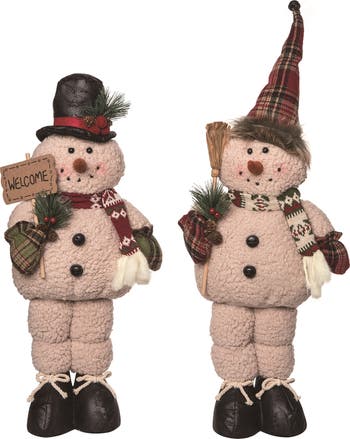 - Adorn your home this Christmas with the Transpac Plush Rustic Standing Snowman Set of 2, crafted from soft polyester for a cozy, festive touch, each standing 18 inches tall and perfect for indoor tabletop decoration. Easy to maintain with simple spot or wipe clean care, ensuring your festive decorations stay looking fresh and vibrant throughout the holiday season. Bring festive cheer to your home this Christmas with the Transpac Plush Rustic Standing Snowman Set of 2, featuring charming multicolor designs, perfect for tabletop decoration and gift giving. Whats Included: 1 set of these beautiful, easy to care for plush decorations.