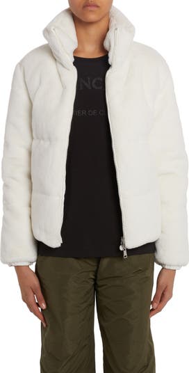 Touchably soft fleece adds to the cozy appeal of a down-filled puffer jacket branded at the sleeve with Moncler's iconic cockerel patch.