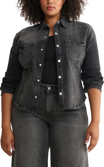 An inky faded wash adds edge to this stretch-kissed denim shirt accented with silvery snaps.