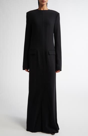 Known for clean-lined minimalism and meticulous craftsmanship, the Stockholm-based label brings its Scandi-cool aesthetic to this elegantly effortless evening dress. The pocketed style is tailored from drapey double crepe in a body-skimming silhouette with strong shoulders and a pooling hem.