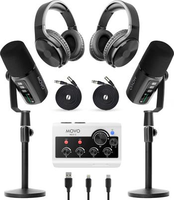 - Movo Podcast Equipment Bundle for iPhone & Android – Professional Podcast Studio Kit with Audio Interface, 2 Dynamic Mics, 2 Headphones, and Table Stands – Compatible with Smartphones, PC, and Mac