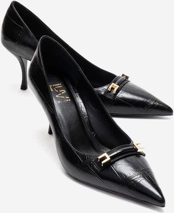 A refined stiletto that blends timeless sophistication with croc-textured surface and a minimalist metal accent