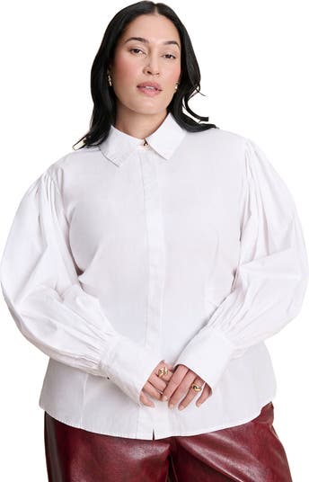 - Upgrade your essentials with this crisp poplin button-up shirt, framed by statement poet sleeves and a refined collar. The tailored silhouette and soft feel create a timeless, polished look.