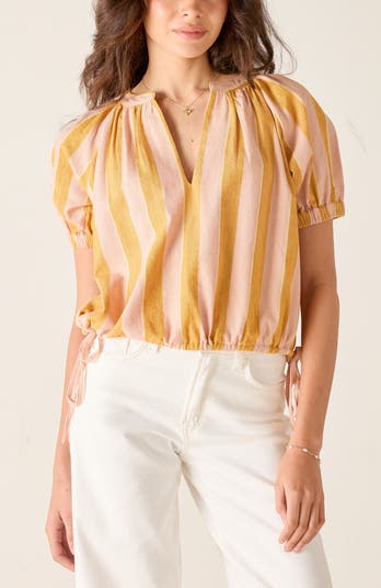 A top made for the romantics and elegantly named Poète. This lightweight cotton blend is designed with flattering details that make dressing up feel effortless. The apricot stripe pattern brings a fresh look to summer days, with yarn-dyed stripes made in India—adding richness and intention to both the color and the craft. The gathered v-neckline and cinch tie waist perfectly complement the short sleeves with elastic cuffing—simply an artistic piece.