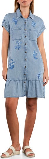 Floral appliqués and a ruffle-trimmed skirt add delightful dimension to this casual yet sophisticated minidress.