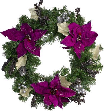 Add this beautiful Christmas wreath to your holiday decor! The wreath features purple poinsettias with gold leaves. The silver pine cones, cranberries, and black sparkling berries for the perfect mixture of color to capture your guest's attention. This 24-inch wreath works perfectly at home or at the office, bringing a bit of holiday cheer wherever you go. Product Features: Two-tone artificial pine Christmas wreath Large purple poinsettias with gold leaves and silver pine cones Accented with silver cranberries and black sparkling berries Silver glittered finish Unlit Recommended for indoor use - if using outdoors place under a covered area No assembly required – wreath comes in 1 piece Includes a heavy-duty ring metal frame backing for hanging Dimensions: 24" diameter (measured from outermost tip/edge to outermost tip/edge across the wreath) Material(s): PVC/foam/metal