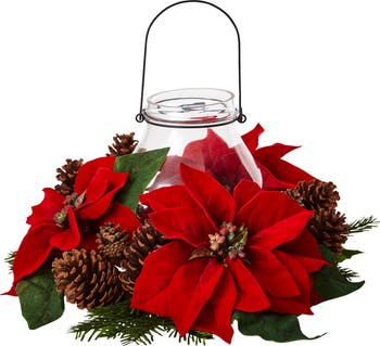 A virtual cornucopia of holiday fun, this Poinsettia, Pine, & Pinecone Candelabrum will be the hit of your holiday table. With bold, beautiful poinsettia blooms, soft greens, wispy pine needles, and authentic looking pinecones, it's a mix of texture and color that can't be beat. Rounding it out is the included glass candleholder, complete with metal handle. Makes a wonderful gift.