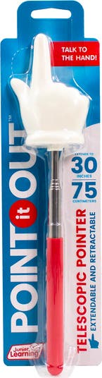 POINT IT OUT: TELESCOPIC POINTER - Telescopic Classroom Pointer. Make your presentations more engaging and interactive with Point It Out!, the telescopic pointer that extends up to 30 inches. This retractable pointer features a plastic finger that allows for precise pointing to whiteboards, screens, or visual aids, making it an essential tool for any classroom or presentation. Whether you're teaching, presenting, or just having fun, Point It Out! brings your content to life with ease and precision. The comfortable rubber handle ensures a secure, ergonomic grip, making it easy to use for extended periods without discomfort. Plus, its retractable design allows for quick and compact storage when not in use, making it as practical as it is fun. Perfect for teachers, presenters, or anyone looking to add a bit of flair to their discussions! The perfect tool for engaging your audience and bringing your presentations to life. KEY FEATURES: Extends up to 30". Plastic finger tip. Comfortable rubber handle. Easy Grip. Retractable design. Easy Storage.