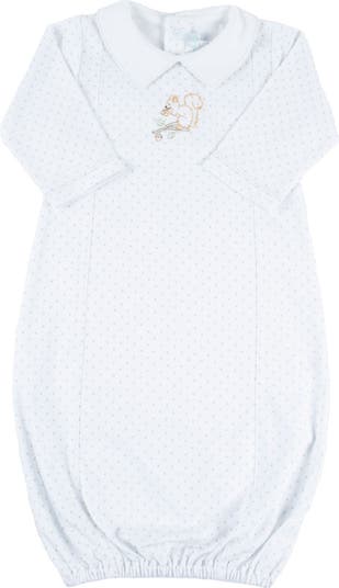 Our Pointed Collar Little Squirrel Gown is the perfect gown for your baby. Meticulously hand embroidered with an intricate little squirrel design on sage green polka dot Pima cotton fabric. Buy now to have it on hand for the holiday season. The detail on this gown is stunning and makes the perfect gift. Heirloom quality made with the utmost care. This Pointed Collar Little Squirrel Gown is comfortable enough to sleep in, and elegantly designed to wear during the day. Made of 100% Pima Cotton with a snap closure at the neck and elastic opening at the feet. The perfect gift to give your favorite newborn and to also receive!