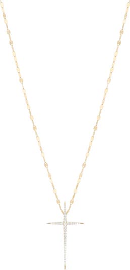 Dazzling bright-white diamonds shine perfectly on the cross-shaped pendant that centers a mirror-chain necklace shaped from 14-karat gold.