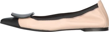 Pointed toe elasticated ballet flat in soft leather with patent tip and buckle detail