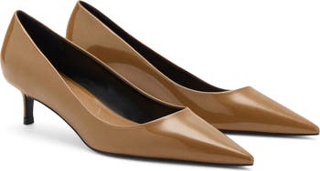 Sharpen your ensemble with this extraglossy pump fronted with a pointy toe and balanced on a walkable kitten heel.