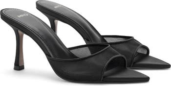 A pointy toe furthers the streamlined profile of a minimalist slide sandal featuring a breathable mesh upper and lifted by a stiletto heel.
