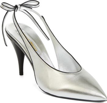 This pointy-toe pump made a stunning appearance on the label's 'Salt Looks Like Sugar' runway with its metallic lambskin leather, tapered heel and bow-embellished slingback strap.