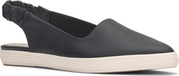 A scrunched slingback strap unexpectedly innovates this pointy-toe shoe that's shaped from smooth leather and set on a sneaker-inspired sole.