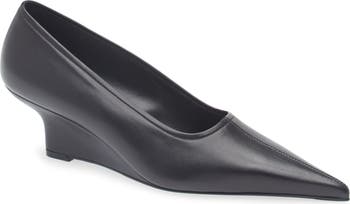 A curved wedge heel and sharply dipped topline enhance the sculptural silhouette of a napa-leather pump sharpened with a dramatic pointy toe.