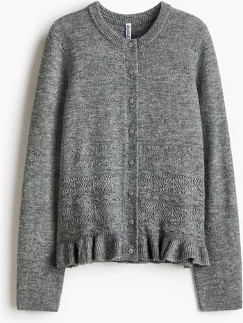 Cardigan in a soft, fine knit with pointelle-knit sections. Round neckline, buttons down the front and a frill trim at the hem.