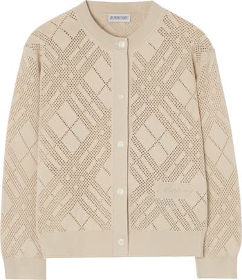 A soft cotton cardigan knitted with a pointelle Burberry Check. The crew-neck style is framed by rib-knit trims and finished with an embroidered logo.