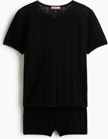 Pyjamas with a T-shirt and pair of shorts in pointelle-knit cotton with picot trims. T-shirt with a round neckline and a straight-cut hem. Shorts with concealed elastication at the waist.