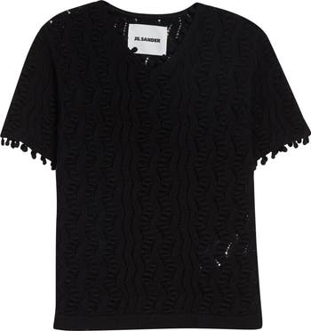 Delicate lace-inspired pointelle stitching brings airy charm to a short-sleeve cotton sweater finished with beaded trim.