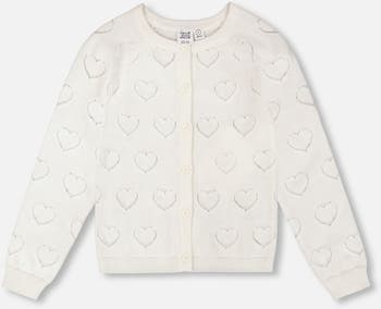 The pointelle knit cardigan is a sweet layering piece for young girls. This cardigan features a delicate allover heart motif, front button closure, and long raglan sleeves for extra comfort. Made from 100% cotton, it belongs to the "Girls Must-Haves" collection, offering softness and charm for everyday wear.