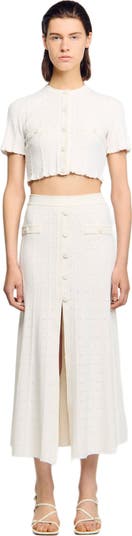 Midi skirt with a slit in decorative pointelle knit, featuring a decorative button placket and side pockets.