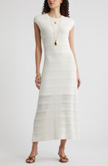 Delicate pointelle adds pretty texture to this summerweight dress styled simply with a crew neck and cap sleeves.