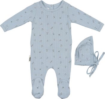 Leaves scatter across this pointelle-knit footie framed with long sleeves and paired with a matching hat to give baby extra coverage.