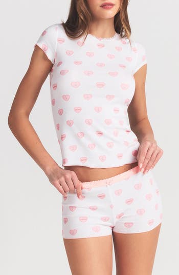 Experience all the love in one perfect pointelle set. These pajamas include a body-hugging baby tee with a center bow accent and lace trim at the neckline. The cheeky shorts feature a logo-patterned picot elastic waistband.