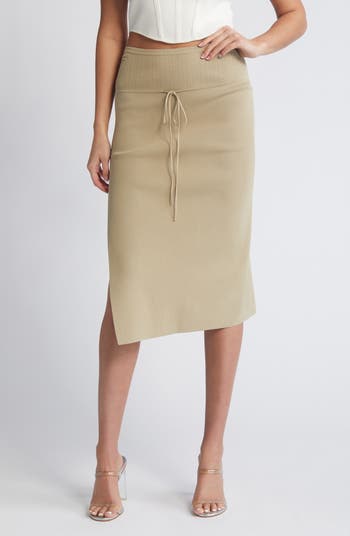 An earthy neutral hue makes this knit sweater-skirt with pointelle stitching at the waist a curve-hugging classic you'll wear all year 'round.