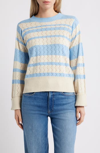 Crisp stripes and a double-layer neckband look fresh on a pointelle-knit sweater fashioned from a soft cotton blend with rib trim at the cuffs and hem.
