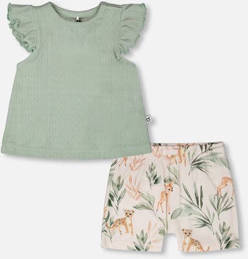 The pointelle top and organic cotton jersey short set green and peach with deer print is a sweet essential for sunny days. The delicate green top with flutter sleeves and buttons on the shoulder pairs perfectly with our soft peach shorts adorned with allover playful deer and leafy accents. The top is crafted in breathable pointelle with a hint of stretch, while the shorts are made from organic cotton jersey for softness and comfort. Perfect for warm-weather strolls and playtime, this outfit blends elegance and lightness.