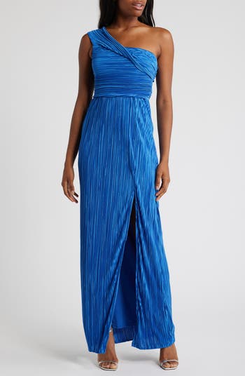 Lustrous plissé fabric lends beautiful dimension to this one-shoulder gown that has a front slit for fluid movement.