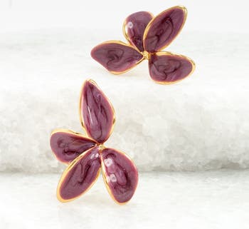Our Poised Petal Earrings in rich plum are crafted in 14K plated gold with layers of luminous enamel, creating a petal-like silhouette full of grace and strength. Every purchase supports survivors here at Starfish Project as we build new lives of freedom and opportunity. Pair them with cosy knits or a little black dress, or gift them as a meaningful symbol of resilience and beauty. Materials: 14K Gold plated brass with enamel earrings with sterling silver posts Hypoallergenic; lead and cadmium free with nickel content less than 100 ppm. Size: 1 inches