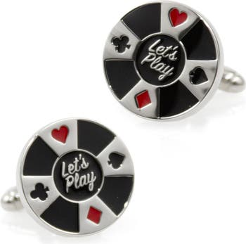Designed in a bold black, red and silvertone design, these poker-themed cuff links feature the four card suits - hearts, spades, clubs and diamonds - along with a playful message at the center. Made for the high roller, poker night regular or Vegas enthusiast, these cuff links add a winning hand to any formal look.
