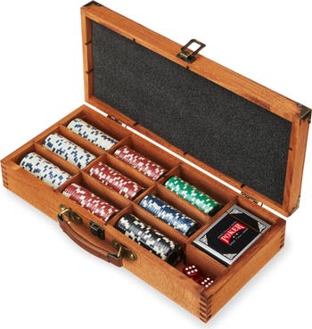 - Includes 2 card decks, 2 dice, and 225 poker chips Wooden box, brass details, and faux leather handle Dimensions: 3″ H x 15″ W x 7.5″ D