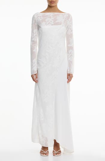 Embrace modern flair in this stunning floral-burnout maxi dress featuring a removable slip lining and a bold side slit that soars up high, creating an asymmetric hem.