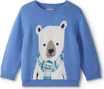 A polar bear in a snowflake scarf brings bright, wintry cheer to a sweater knit in part with breathable cotton to keep your little one comfy all season long. Roomy enough for easy on and off, it makes an adorable layer and washes in your machine whenever it needs a cleaning.