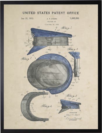 This vintage-inspired print, framed in a black wooden frame, features a police cap patent. Sized at 16 inches by 20 inches, this made in the USA frame makes for a beautiful addition to any wall.