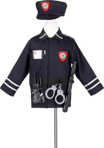 Beautiful Souza costume, depicting a police officer in navy with reflective details. The costume consists of the following: A police jacket in navy with reflective details. A cap in navy with an embroidered patch in red with a police star and the text "Police". A set of handcuffs in grey plastic. A police stick in black plastic. A walkie talkie in black plastic. The Souza police jacket comes with long sleeves and a classic collar in black. There are grey reflective stripes around the jacket, so the police officer can be seen in the dark. On the front there is an embroidered patch in red with a police star and the text "police" on the left side and on the right side there is a name tag. The jacket opens with velcro on the front. In addition, there is a pocket and velcro straps on the front, so the officer can have handcuffs, a police stick and walkie talkie with him. The police cap comes with a wide brim and it can be adjusted with velcro at the neck. Two handcuffs are included.