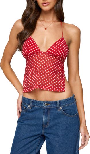 Bring an updated-pinup vibe to your warm-weather rotation with this flirty halter top featuring a daring backless design and retro polka dot pattern.