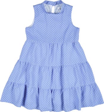 This youth girls' periwinkle-and-white polka dot dress showcases a charming shirred tiered skirt crafted from airy seersucker fabric. Complete with back buttons and zipper, it offers playful sophistication for special occasions or everyday elegance.