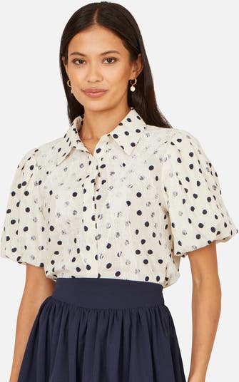 This super cute polka dot shirt has extra style points with trending lace details on the bodice. The boxy shape is perfect for styling with everyday fits, think denim skirt and jeans. The short sleeve style gives it a real look of spring time and it's something you'll be able to style over and over.