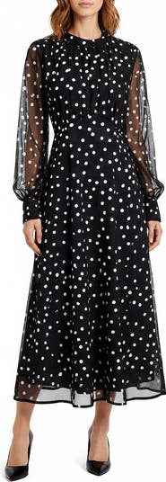 Be sweetly spotted in a black-and-white dress dappled in dots and set with sheer sleeves.